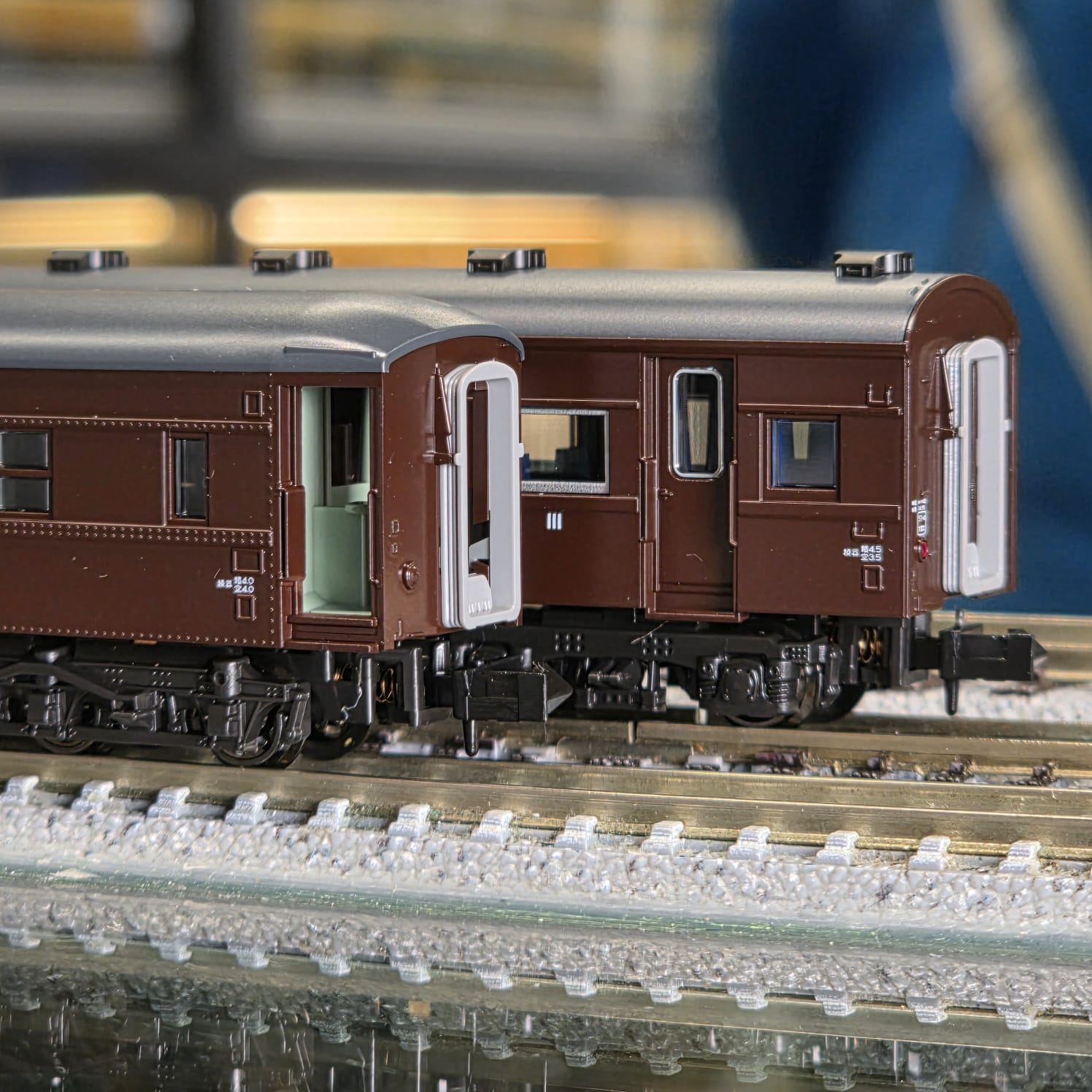 客車窗細節: スハフ42 與 オハ47 的車門窗均採用 H 橡膠支撐形態;各車洗手間與廁所窗戶的形狀也依實車差異分別製作。