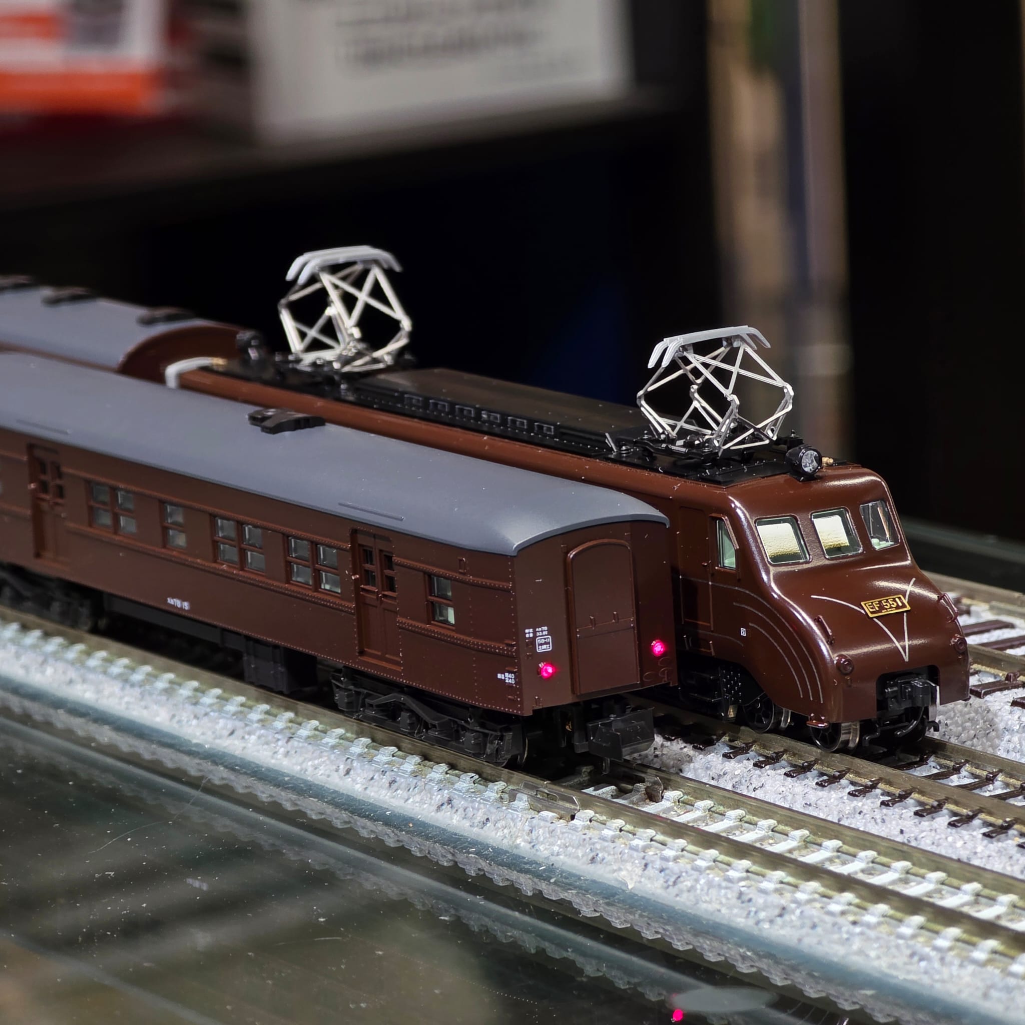 重現 EF55 復活運轉當時,非乘降平台側的貫通門被封鎖且側面平台無門的狀態(屋根煙囪保留、尚未安裝雨槽/縱向排水管)。